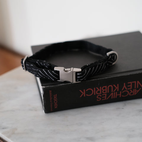 S’il fallait résumer la simplicité en un détail, ce serait peut-être ça. Un collier noir, intense, relevé d’un motif discret en chevron clair, presque graphique. Entièrement fabriqué à la main à Barcelone, ce collier associe le confort d’un ruban en nylon souple, à l’exigence d’un tissu Kvadrat au tombé irréprochable. Le tout ponctué d’une boucle métallique gris mat, à fermeture clipsable, pensée pour ne jamais brusquer ni le chien ni le geste. Ni voyant, ni basique, ce collier est ce qu'il y a de plus fonctionnel. Un basique.